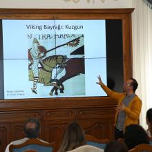 Etkinlik, Bölüm Başkanımız Doç. Dr. Mine Özyurt Kılıç’ın karşılama konuşması ile başlayıp Dr. Selahattin Özkan'ın Ortaçağ Avrupası'nda Vikinglerin oynadıkları önemli rolleri anlatmasıyla başlamıştır. Günümüzde dahi büyük ilgi çeken Viking mitolojisinin tarihsel artalanını aktaran Dr. Özkan, ortaçağ kökenli tarihsel kaynaklar, Viking efsaneleri ve edebi eserler arasındaki ilişkileri incelemiştir. Vikinglerin İngiltere topraklarındaki etkisi hakkında bilgiler de veren Dr. Özkan, Dan soyundan gelen Queen Anne'in eşi olan İskoç Kralı VI. James'in (İngiliz tarihi için I. James) Viking mitolojisinden de etkilenerek 1597 yılında kaleme aldığı Türkçeye çevrilmeyi bekleyen Demonology adlı eserine de değindi.